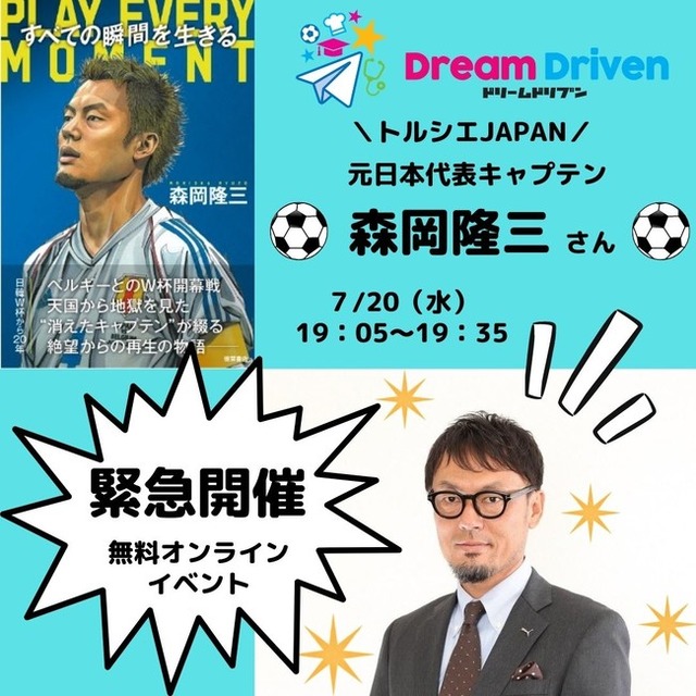 日韓W杯から20年。当時、トルシエJAPANキャプテンとして日本代表を率いた森岡隆三氏は、現在ジュニアチームで小中学生の育成に力を注いでいる。そんな森岡氏と同級生のDreamDrivenプロデューサーが、対談形式で「これからの日本の子どもの教育」についてアツく語ります!7/20(水)19:05~19:35、パパママ必見!お申し込み不要の無料オンラインイベント!
