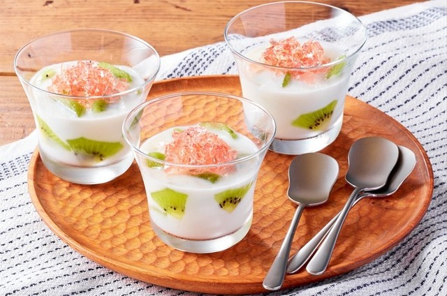 電子レンジ加熱して材料を混ぜ、冷やし固めるといった簡単な手順で作れる冷たい牛乳寒天は、相性の良いキウイといちごのシロップがアクセントに。調理を通じて身近な食の知識やフードロスの課題について学べ、お子さまが主体的に取り組むことができるミールキットです。