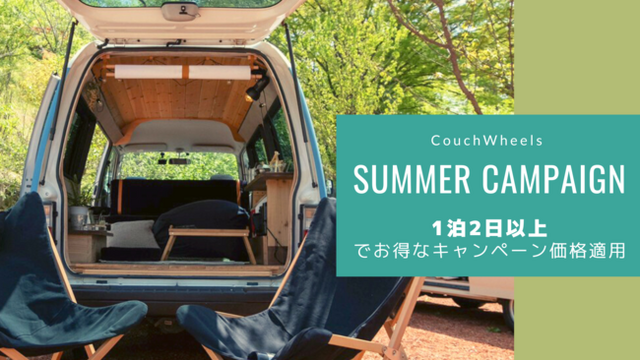 平年より厳しい暑さと予想される今年の夏。高原や山などで、涼しくおしゃれに過ごしていただきたい!ということで通常価格よりお得な価格でご利用いただけるサマーキャンペーンを開催します!当社ホームページからのご予約について、1泊2日以上&7月~8月のご利用でキャンペーン価格を適用いたします。返却日の22:00まで利用可能なので、ゆっくりお過ごしいただけます。キャンピングカーは、テント設営不要、カギがかけられて防犯・貴重品管理が簡単なので、初心者キャンプや女子キャンプにもおすすめです!