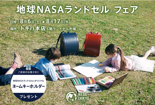 ランドセルの企画・販売を行う池田地球株式会社(本店:東京都港区:代表取締役 村尾光一)は、 8/6(土)~8/17(水)の期間限定で、トキハ本店 6階ランドセル売場にて「地球NASAランドセル(R)フェア」を開催いたします。