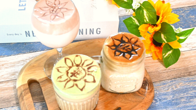 バリスタから学ぶ、子供向け「ひまわり」のラテアート講座です。今注目されている「ダルゴナコーヒー」でラテアートを施したアイスドリンクを作ります。子ども向けにココアや抹茶、夏らしくかき氷シロップを使ったラテアートをご紹介します。