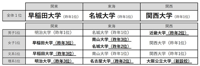 ■東海エリアでは全体で「名城大学」が6年連続で1位となり、「名古屋大学」が2位となった。