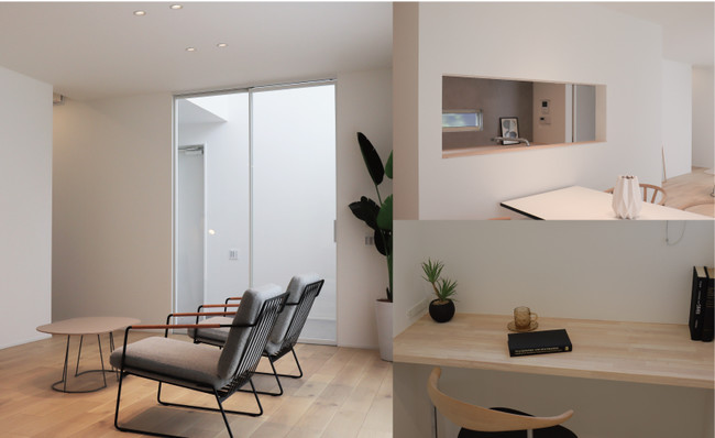 ・特徴:ダイニングの一角に吹き抜けをつくり、上から採光することで、住宅街の長細い敷地でも明るく暮らせるよう設計しております。リビングからはウッドデッキを通じて視界が広がり、リビングの奥の畳コーナーも上部に吹き抜けがあることで、明るく開放的な空間となっております。全館空調※2を設置していることで24時間365日室温を一定に保つことができ、部屋ごとに温度差が生じないなどの快適性をご体感いただけます。また、電気錠、照明、エアコン、ガス給湯器がインターネットに繋がり、スマートフォンから遠隔操作できるIoTシステムも体験できます。