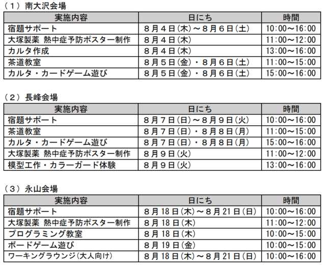 大学生等による学習補助・宿題サポートやカルタづくり、カラーガード(旗振り)体 験、大学生によるプログラミング教室、企業による熱中症予防ワークショップのほか、 茶道体験などを予定しています。(各会場によって講座内容は異なります) 各講座は1時間程度の予定です。(出入りは自由にしていただいて構いません)