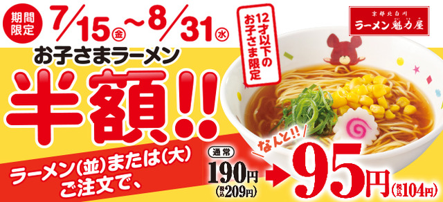 夏休みシーズン到来、7月15日(金)から「お子さまラーメン半額フェア」を期間限定で開催いたします。ラーメン(並)または(大)をご注文いただくと、なんと!お子さまラーメンが半額でお召し上がりいただけます!