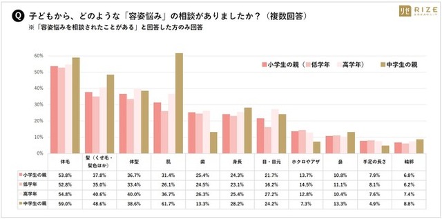 「実際にどのような悩みを相談されたか」を問うと、小学生の場合「体毛の悩み(53.8%)」、中学生は「肌の悩み(61.7%)」がそれぞれトップ回答に。ランキング順だと小学生は【1.体毛 2.髪 3.体型 4.肌 5.歯】、中学生は【1.肌 2.体毛 3.髪 4.体型 5.身長】でした。
