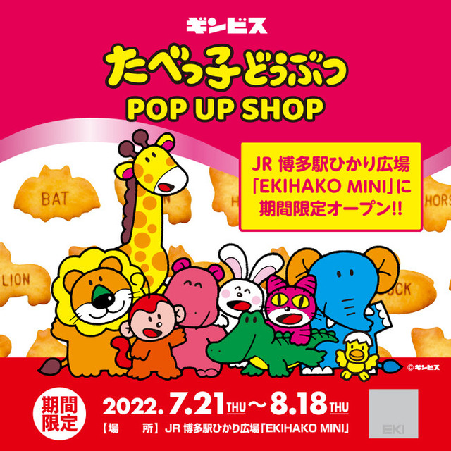 みんな大好き!ギンビスのロングセラー商品『たべっ子どうぶつ』をモチーフにしたグッズや菓子商品が、JR 博多駅ひかり広場「EKIHAKO(エキハコ)」にやってくる!ぬいぐるみ、ポーチ、バスボール、ランチ系など、たべっ子どうぶつの魅力的なアイテムが勢揃い!また、ここでしか手に入れることができないノベルティグッズもご用意して皆様のお越しをお待ちしております。