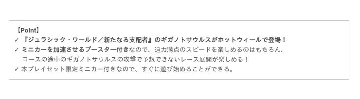 2022年7月29日に公開する映画『ジュラシック・ワールド/新たなる支配者』に登場するギガノトサウルスがホットウィールで登場!ミニカーを加速させるブースター付きなので、迫力満点のスピードを楽しめるのはもちろん、コースの途中のギガノトサウルスの攻撃で、予想できないスリリングなレースを楽しめます。また現在発売中のトラックセットと繋げて、ワクワク感のあるコースを作って遊ぶことはもちろん、本プレイセット限定のミニカー付きなので、すぐに遊び始めることができます。