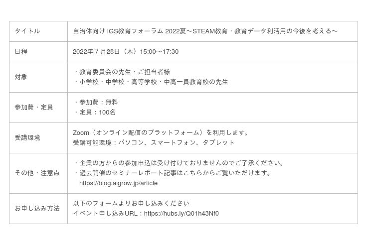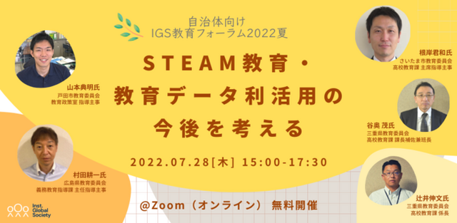 Institution for a Global Society 株式会社(本社 東京都渋谷区、代表取締役社長 福原 正大、以下 IGS)は、「自治体向け IGS教育フォーラム2022夏~STEAM教育・教育データ利活用の今後を考える~」を、2022年7月28日(木)15:00~17:30にオンラインで開催いたします。