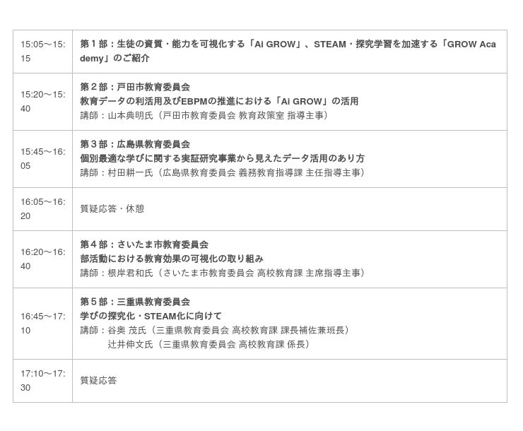 そこで、本イベントでは、広島県、三重県、さいたま市、戸田市で教育施策を現場から推進しご尽力されている先生・ご担当者をお招きし、STEAM教育・教育データの利活用をテーマに、各自治体で実施されている先進的な取り組みとその効果及び、予算獲得に向けた動きなどについてお話しいただきます。