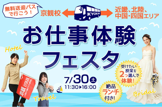 京都ホテル観光ブライダル専門学校は、2022年7月30日(土)にオープンキャンパス「お仕事体験フェスタ」を開催します。 今回のオープンキャンパスでは遠方の方も気軽に参加できるよう、JR福井駅・敦賀駅・長浜駅・彦根駅・草津駅・西舞鶴駅・綾部駅・福知山駅・坂出駅・岡山駅・高松駅・徳島駅・豊岡駅・丹鉄峰山駅・丹鉄宮津駅、洲本ICからの無料送迎バスを運行します。また、京都市内高級ホテルと企画した京観オリジナルお弁当付きの特別イベントです。