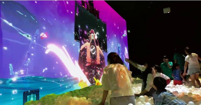 数万個のボールに投影される光の波紋は、子どもたちの動きに合わせてまるで本物の水面のように絶えず変化し、ウォーターライドに乗っているかのような浮遊感を体感できます。