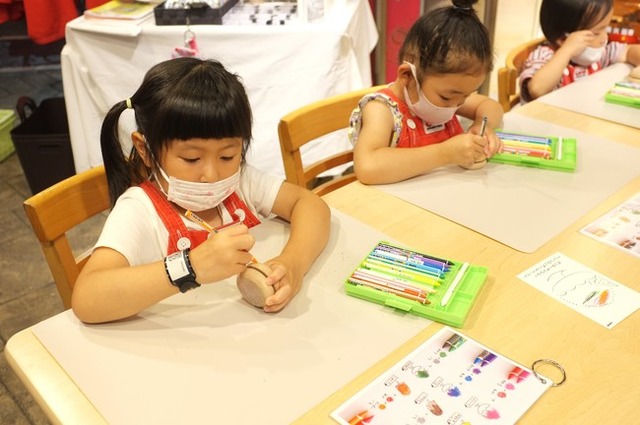 イベントではいろいろな素材に描ける工作用色鉛筆「ポンキーペンシル」を使って、木製のヨーヨーをカラフルに色塗りしデザイン体験に挑戦しました。(所要時間約30分)