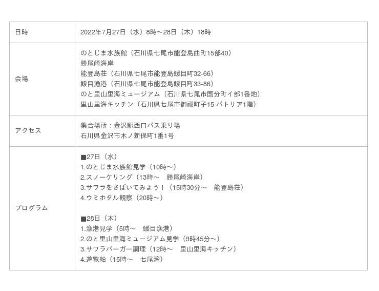 海と日本プロジェクトin石川県実行委員会は、7月27日(水)・28日(木)の一泊二日で、小学校5・6年生20人が参加するイベント【七尾湾「海のゆりかご」海の環境調査隊!】を開催いたします。