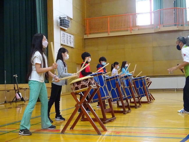 和太鼓の演奏体験では、希望者を募ると多くの子供たちが元気よく手を挙げたり、奏者に楽器についての質問をしたりするなど、興味津々な様子で参加していました。
