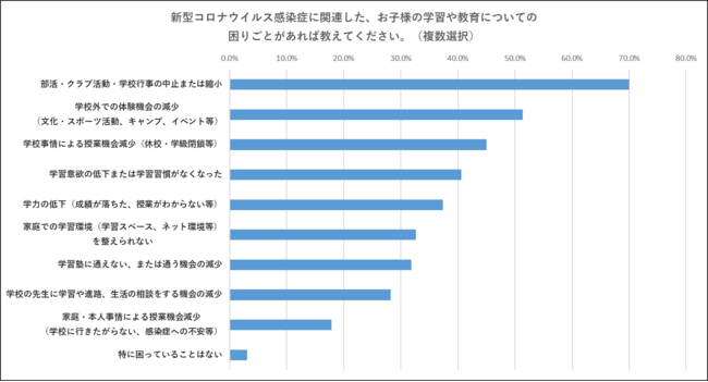 また、困りごととして「学校内外の体験機会の減少」と回答した割合が最も多く、部活動や学校行事などの「学校内の体験機会減少」と回答した割合は約7割、文化・スポーツ活動などの「学校外の体験機会減少」と回答した割合は約5割でした。