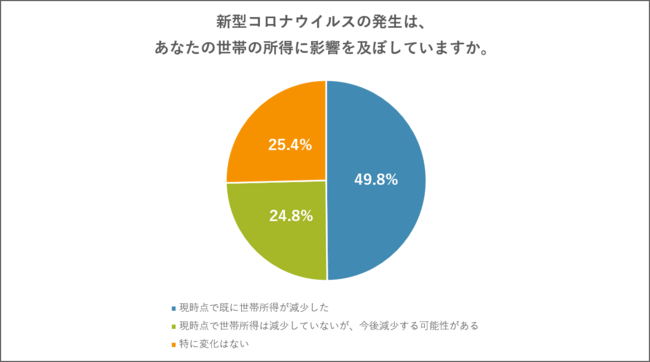 新型コロナウイルスの発生による世帯所得への影響を調査したところ、「現時点で既に世帯所得が減少した」との回答が49.8%、「今後減少する可能性がある」との回答が24.8%に上りました。