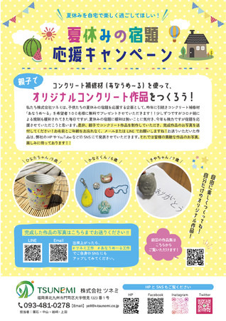 株式会社ツネミ(本社:北九州市門司区、代表取締役:廣石武彦、以下「当社」)は、2022年7月25日(月)9時から子供たちの夏休みの宿題応援キャンペーン”として、先着限定100人に対して、自社ECサイトを通じてコンクリート補修材「あなうめ~る100g」を希望者に無料で提供します。弊社は、コンクリートの補修材メーカーとして、用途が分かりやすいネーミングや誰でも簡単に使える利便性から全国のプロユーザーからDIY愛好家まで、幅広いお客様に使用していただいております。