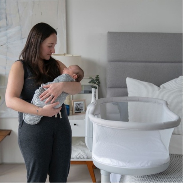 右のスワドルウイングを同様に巻きつけ、左ウイングの面ファスナーテープに密着させるようにします。赤ちゃんは必ず仰向けで寝かせましょう。