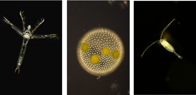 (左:ノロ、中央:ボルボックス、右:ヤマトヒゲナガケンミジンコ)