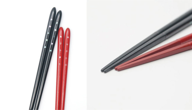手書きメッセージをプリントする箸は箸先の形状を四角形に加工し、つまみやすく使いやすい箸を採用しています。箸の持ち手部分の両面に螺鈿がきらめく一膳となっております。