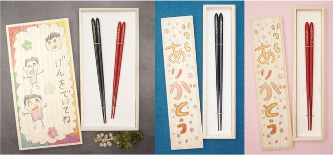 なかなか会えないおじいちゃんおばあちゃんに、手書きのメッセージやイラストをそのまま箸や桐箱にプリントして、日頃の感謝の気持ちを伝えられる敬老の日の特別なお箸のギフトセットをご用意いたしました。