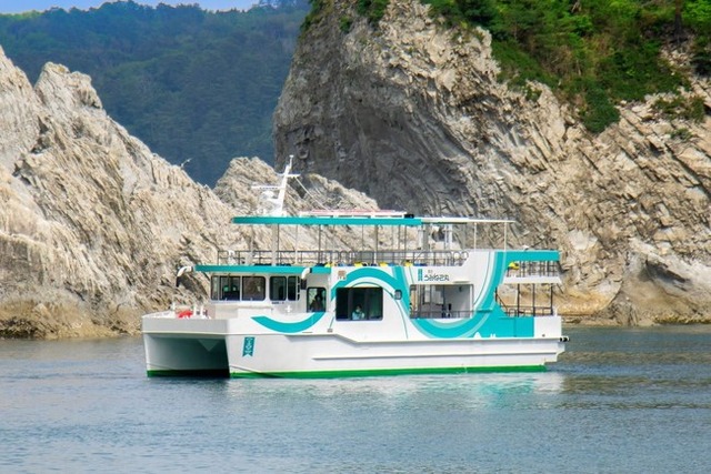 58年間運行していた遊覧船の運行終了から1年半、浄土ヶ浜観光の象徴として遊覧船の復活を望む市民の声が届き、宮古市の新しい遊覧船「宮古うみねこ丸」が就航しました。全長18.8mの2階建てで、客室定員は80名。横波に強く、デッキスペースの広い双胴船でバリアフリー設計です。