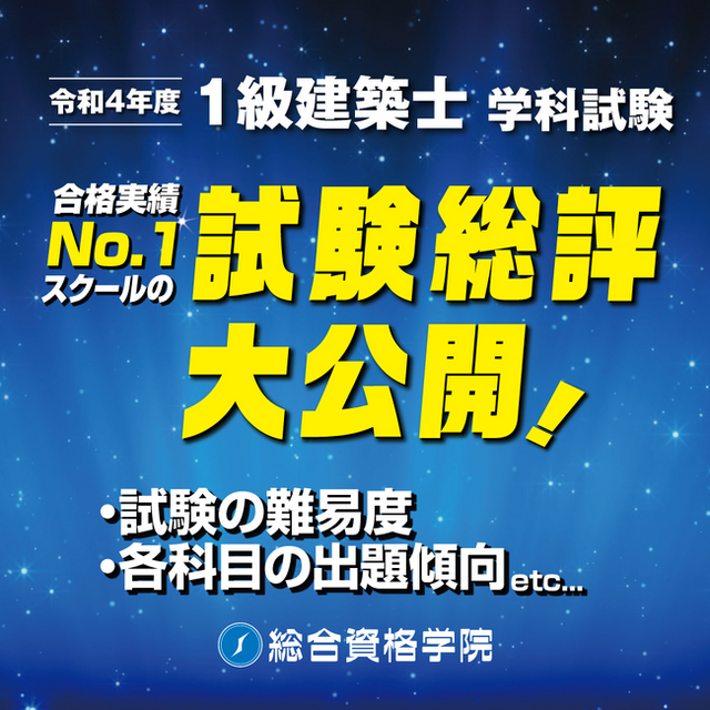 学科試験の全体総評に加え、各科目の難易度や、出題傾向等の掲載を予定しています。総合資格学院の受講生に限らず、どなたでも無料で閲覧可能となっているため、試験後の振り返りや、今後の受験対策にお役立てください。