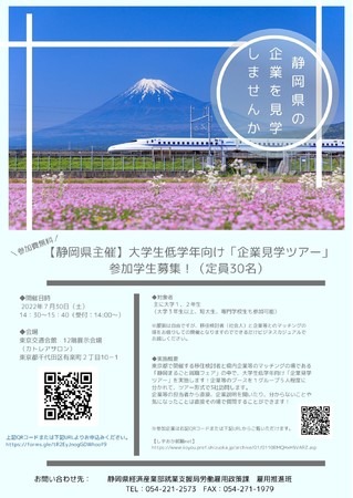 参加無料。大学3年生以上も参加可能です。静岡県の企業を見学しませんか。