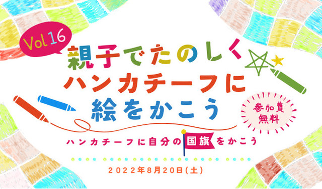 ハンカチーフは手を拭く汗を拭く以外に、お弁当を包んだり、バッグに巻いたり、部屋に飾ってアートとしても楽しめることを広めるため、当社では『親子でたのしくハンカチーフに絵をかこう』のイベントを開催しています。これまでに2,400名以上のご家族に参加頂きました。第16回となる今回は、2年半ぶりにオンラインではなくリアル開催をいたします。