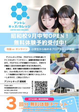 ヒューコムエンジニアリング株式会社およびグループ会社のピコピコピーコ株式会社は、ITを主軸にしたカリキュラムとキャリア教育の力で、子どもたちがジブンの"未来"を描くチカラを育む場所を全国へ展開する株式会社アントレキッズ(本社:東京都渋谷区、代表取締役西田祥)のフランチャイジーとして、2022年9月に山梨県初となる教室を昭和町に開校することと、開校記念の無料イベントを開催することとなりましたのでお知らせ致します。