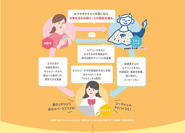 「すららコーチ with kikotto」は、無学年式で一人ひとりの学習進度に合わせた学習の積み上げができる「すらら」の教材に取り組みながら、発達支援の専門知識をもつ相談員に、学習面に加えて生活面や発達支援に関する相談がLINEチャットなどのオンラインツールでできるサービス。元教員やオンライン家庭教師などの経歴や、臨床心理士・公認心理師などの資格をもち、現在は発達支援に携わるスタッフが中心となって保護者に伴走するので、お子様の発達的な特性に配慮した学習設計や、学校や家庭生活での困りごとなどを気軽に相談できます!
