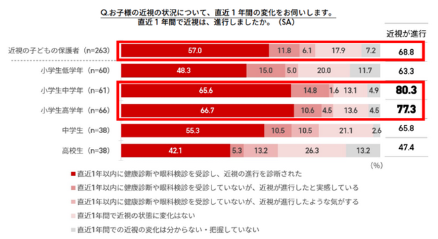 こうした背景を踏まえ、JINSでは近視の子どもを持つ保護者に対してアンケート調査を実施。直近1年間での近視の状況を確認したほか、近視対策への意識や対策方法に関する認知を調べました。