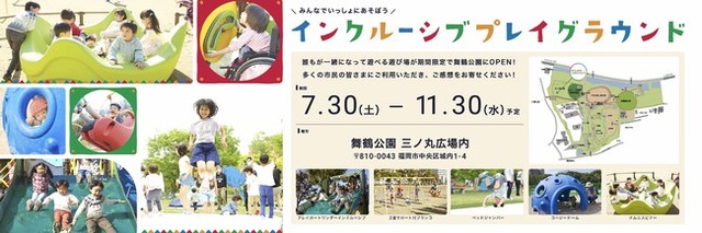 株式会社コトブキは福岡市よりインクルーシブな遊具広場整備指針検討業務を受託し、“あらゆる子どもたちがお互いの違いを理解し合い、一緒に遊べる遊具広場(インクルーシブな遊具広場)”の整備に向けた取り組みを進めております。その一環として、インクルーシブな遊具の体験会を期間限定(7月30日~11月30日)で舞鶴公園(福岡市中央区)にて開催致します。期間中には、体験者の意見を聞くためのアンケートやより理解を深めるワークショップ、イベントも実施します。