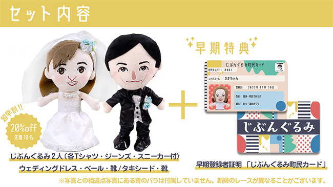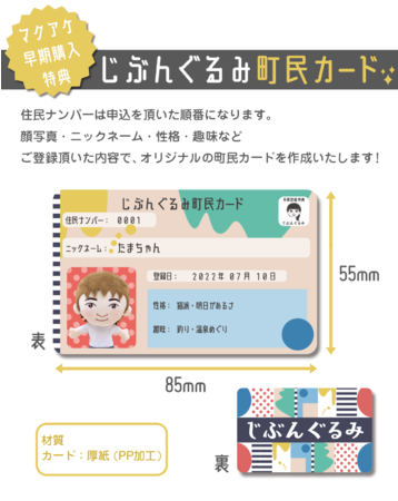 本商品は、応援購入サービス「Makuake」にて、7月26日より先行販売がスタートしています。Makuakeでのご購入者様には1か月以内に順次アバターを作成できる注文フォームをお送りさせて頂きます。商品は12月20日までお届けの予定です。超早割、早割はお得な価格での購入が可能になっています。価格は超早割の場合1体6,644円(税・送料込み)、2体 12,388円(税・送料込み)など様々な応援購入プランがあります。また特別特典として「じぶんぐるみ町民カード」も付いてきます。