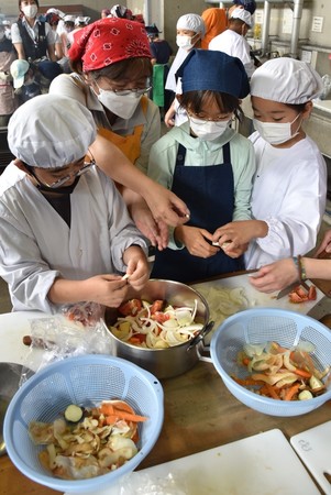 今回は、7月8日(金)に清新小学校5年生の児童らが、若あゆ農園で収穫した野菜などを使って夏野菜カレーを作りました。