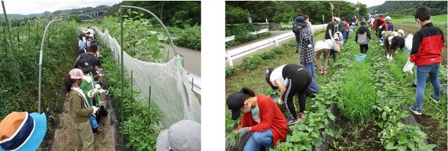 まずは、若あゆ農園で育てたトマトやナスなどの野菜を収穫しました。収穫するだけでなく、草むしりをして農園の整備も行います。