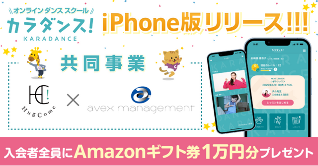 子ども向けオンラインスクールを運営する株式会社ハグカム(本社:東京都渋谷区、代表取締役:道村弥生、以下 「ハグカム」)は、2022年7月27日にオンラインダンススクール「カラダンス!」のiPhone版アプリをリリースしました。2022年4月のiPad版アプリのリリースに続きiPhone※1 でもレッスンを受講可能となりました。これを記念して8月末までに新規ご入会いただいた方※2 全員に1万円分(1ヶ月分月謝相当)のAmazonギフト券のキャッシュバックキャンペーンを実施いたします。