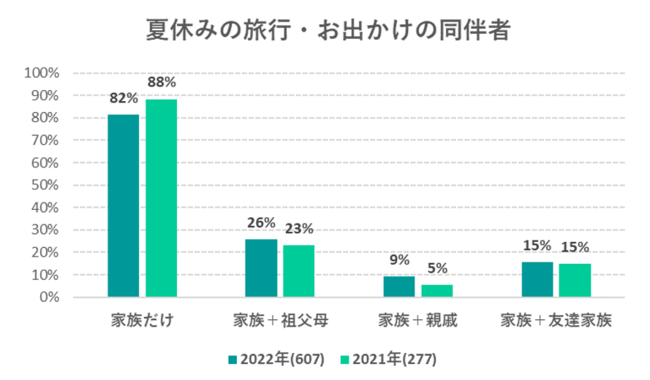 夏休みの旅行・おでかけの同伴者では、昨年も今年も「家族だけ」が最多ですが、今年はその割合が少し減っており、その代わり「家族+祖父母」、「家族+親戚」の割合が増えています。コロナ禍での3年目の夏であり、家族とだけではなく、家族以外の人と旅行やおでかけに行くという人が少しずつ増えてきているようです。