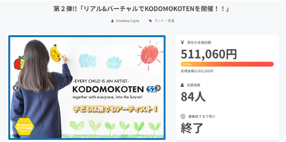 KODOMOKOTENの出展者様募集と認知拡大を目的として、5月末~6月一杯まで-CAMPFIRE-にてクラウドファンディングを実施し、結果として、子ども達の絵画は35点、企業協賛は9社様からご支援いただきました。