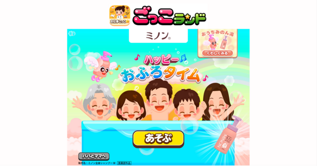 本ゲームを協賛する第一三共ヘルスケア株式会社(以下「第一三共ヘルスケア」)の「ミノン」は、赤ちゃんから高齢の方まで、敏感肌にかかわるすべての方の悩みに寄り添いたいという考えのもと、やさしさにこだわった製品づくりを行うスキンケアブランドです。子どもたちにお風呂に入る楽しさや正しくからだを洗うことの大切さを伝え、スキンケアを身近に感じていただきたいという想いから、『ごっこランド』への出店が実現しました。