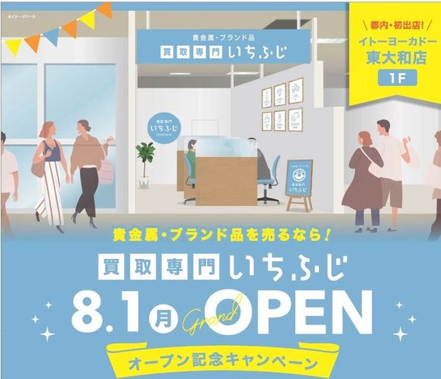 静岡県・神奈川県・愛知県中心に買取専門店「いちふじ」を展開する株式会社インターワーク(東京都千代田区 代表取締役 山尾 利之)は2022年8月1日、東京都東大和市のイトーヨーカドー東大和店に新店舗をオープンいたします。東京都では初の出店となります。