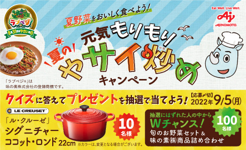 ル・クルーゼの人気調理器具や、旬のお野菜セットと味の素(株)商品詰め合わせが抽選で110名様に当たります。