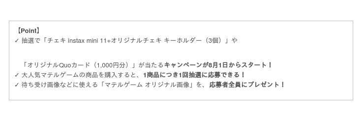 世界大手の玩具メーカー、米国マテル社の日本法人マテル・インターナショナル株式会社(本社:東京都千代田区、代表取締役社長:マーク・パンサール)は、夏休みをより楽しんでいただきたいという気持ちを込めて、対象商品を買って応募すると「チェキ instax mini 11+オリジナルチェキ キーホルダー(3個)」や「オリジナルQuoカード(1,000円分)」が抽選で当たる、プレゼントキャンペーンを8月1日(月)より実施いたします。さらに、応募者全員に待ち受け画像などに使える「マテルゲーム オリジナル画像」をプレゼントいたします。