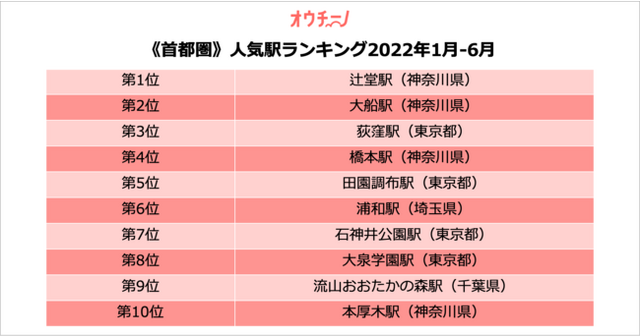 くふうカンパニーグループにおいて、住宅・不動産専門サイト「オウチーノ(https://o-uccino.com/front/)」を運営する株式会社オウチーノは、2022年1月-6月の期間における「オウチーノ」サイトへのアクセス数を集計しました。首都圏(東京都、神奈川県、千葉県、埼玉県)における人気駅ランキングを発表します。