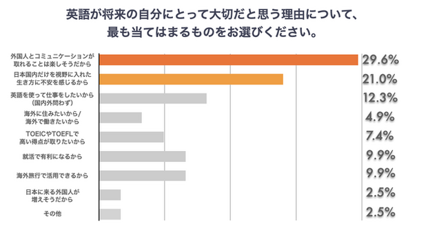 最も多い回答は「外国人とコミュニケーションが取れることは楽しそうだから」(29.6%)となり、約3分の1を占める結果に。次いで多い回答は「日本国内だけを視野に入れた生き方に不安を感じるから」(21.0%)となりました。