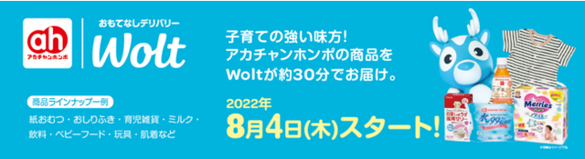 創業90周年を迎えた株式会社赤ちゃん本舗(本社:大阪市中央区)は、デリバリーサービス「Wolt(ウォルト)」を展開するWolt Japan株式会社と提携し、2022年8月4日(木)より札幌、仙台、広島エリアのアカチャンホンポ 計4店舗にてデリバリーサービスをスタートいたします。デリバリーサービスの「Wolt」がベビー用品の専門店と取り組むのは今回が初となります。