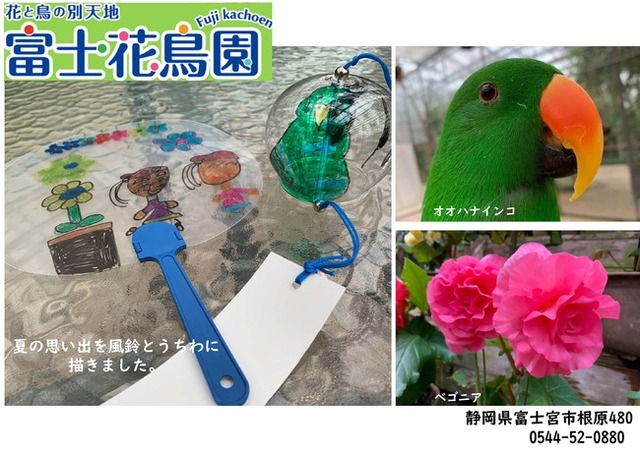 富士山のふもと、朝霧高原にある富士花鳥園でご家族でゆっくりと涼しい夏休みをお過ごしください。そしてお土産に思い出と一緒に手作り風鈴とうちわはいかがでしょうか。キットを購入して好きな絵を描いていただくだけ。モデルは鳥さんや花さん、お父さんやお母さん、なんでもOKです。絵を描くお道具はこちらで準備してあります。