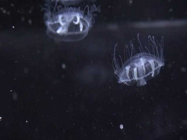 マミズクラゲはゆっくりと浮き沈みしながら、触手で餌を捕まえます。捕まえたエサはカサの中央から下がっている口へ運ばれていきます。カサと口をひねってプランクトンを食べる様子が観察できるかもしれません。