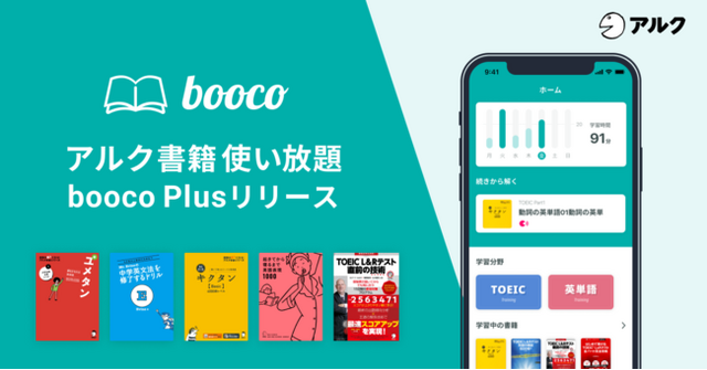 株式会社アルク(東京都千代田区 代表取締役社長:天野 智之、以下アルク)は、英語学習アプリ「booco(ブーコ)」のサブスクリプションサービス「booco Plus」を、新たにリリースしました。「booco Plus」では、アルクの書籍100タイトル以上が使い放題に。さらに、TOEIC(R)対策や語彙習得に特化した学習機能など、日々の英語学習の効率を上げる新機能がご利用いただけます。